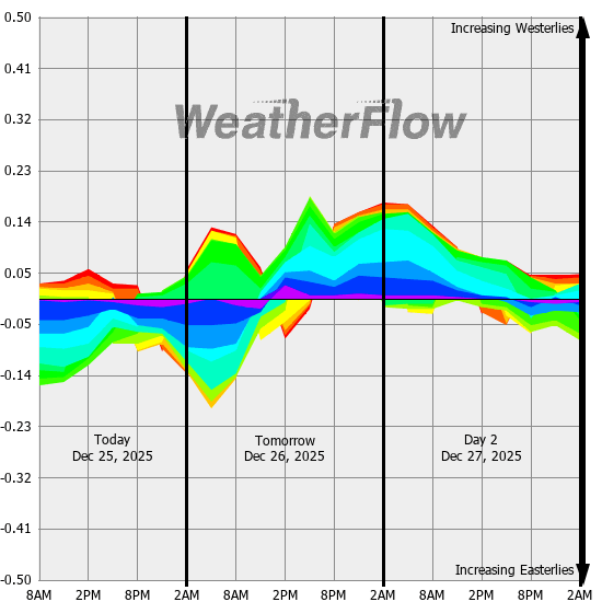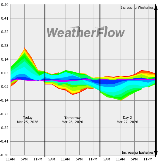 Computer forecast models generally can not resolve the topography of the Gorge and hence model predicted winds are often inaccurate. However, models can predict localized air pressure changes with a great deal of accuracy and it's these pressure differences (gradients) that drive the winds through the Gorge. The above "windbow" is a tool that our Meteorologists have developed to provide a powerful quick look of model predicted gradients.