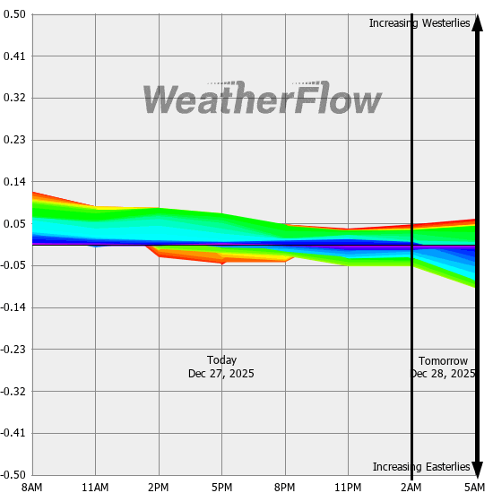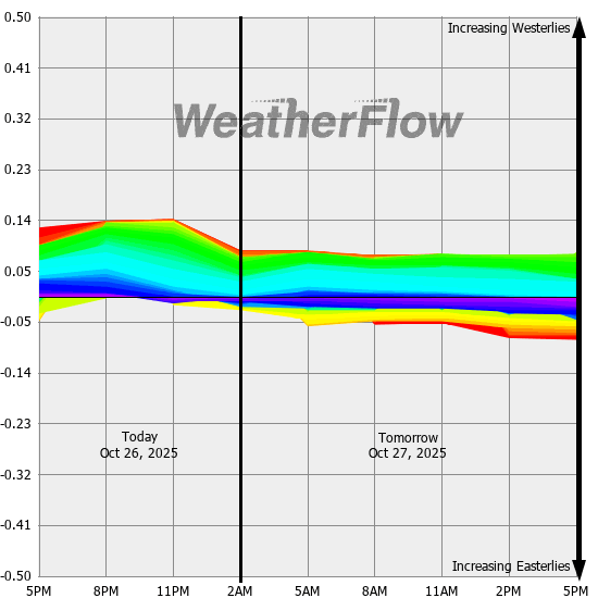 Computer forecast models generally can not resolve the topography of the Gorge and hence model predicted winds are often inaccurate. However, models can predict localized air pressure changes with a great deal of accuracy and it's these pressure differences (gradients) that drive the winds through the Gorge. The above "windbow" is a tool that our Meteorologists have developed to provide a powerful quick look of model predicted gradients.