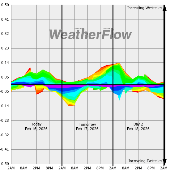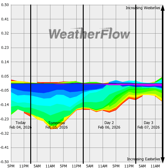 Computer forecast models generally can not resolve the topography of the Gorge and hence model predicted winds are often inaccurate. However, models can predict localized air pressure changes with a great deal of accuracy and it's these pressure differences (gradients) that drive the winds through the Gorge. The above "windbow" is a tool that our Meteorologists have developed to provide a powerful quick look of model predicted gradients.
