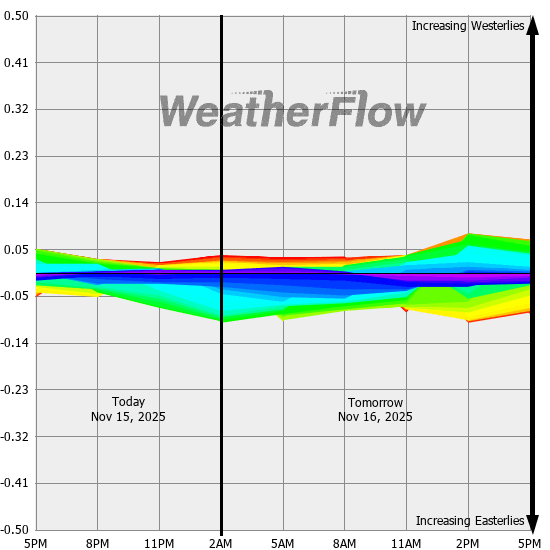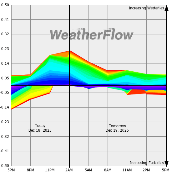 Computer forecast models generally can not resolve the topography of the Gorge and hence model predicted winds are often inaccurate. However, models can predict localized air pressure changes with a great deal of accuracy and it's these pressure differences (gradients) that drive the winds through the Gorge. The above "windbow" is a tool that our Meteorologists have developed to provide a powerful quick look of model predicted gradients.