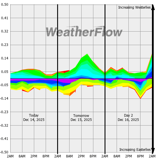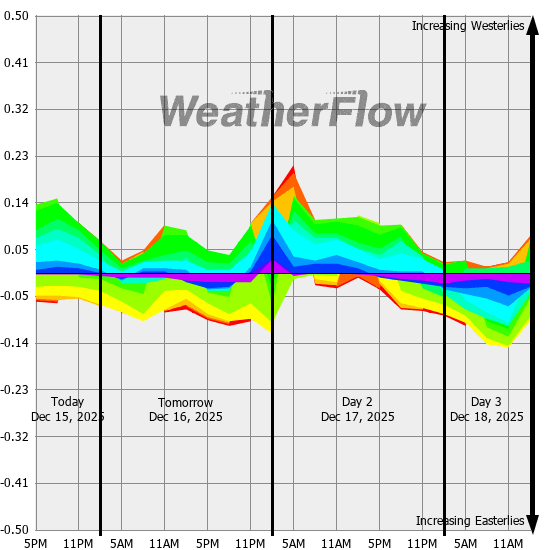 Computer forecast models generally can not resolve the topography of the Gorge and hence model predicted winds are often inaccurate. However, models can predict localized air pressure changes with a great deal of accuracy and it's these pressure differences (gradients) that drive the winds through the Gorge. The above "windbow" is a tool that our Meteorologists have developed to provide a powerful quick look of model predicted gradients.