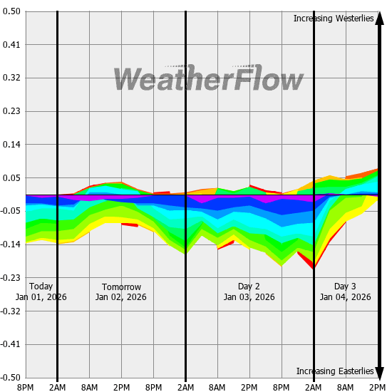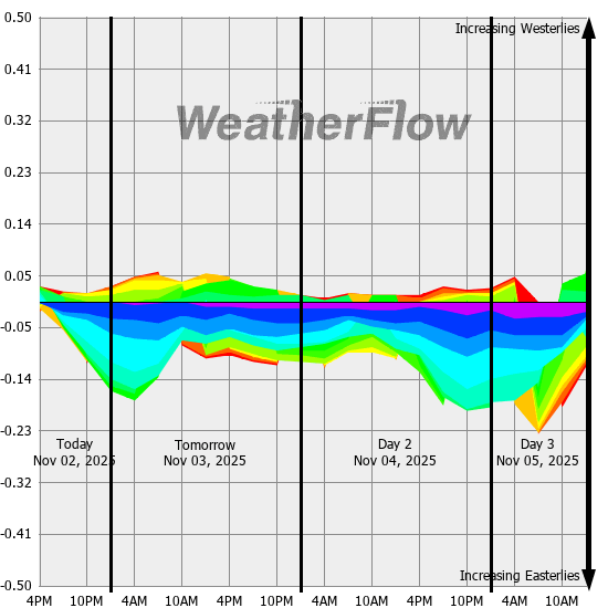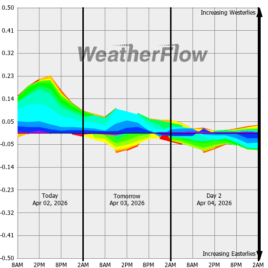 Computer forecast models generally can not resolve the topography of the Gorge and hence model predicted winds are often inaccurate. However, models can predict localized air pressure changes with a great deal of accuracy and it's these pressure differences (gradients) that drive the winds through the Gorge. The above "windbow" is a tool that our Meteorologists have developed to provide a powerful quick look of model predicted gradients.