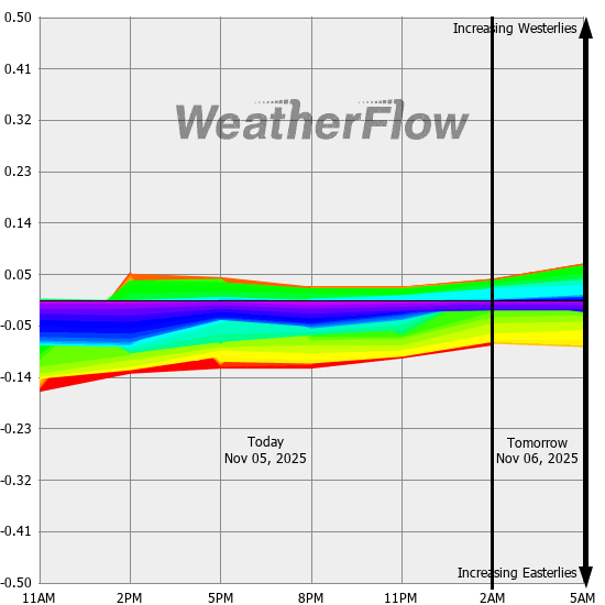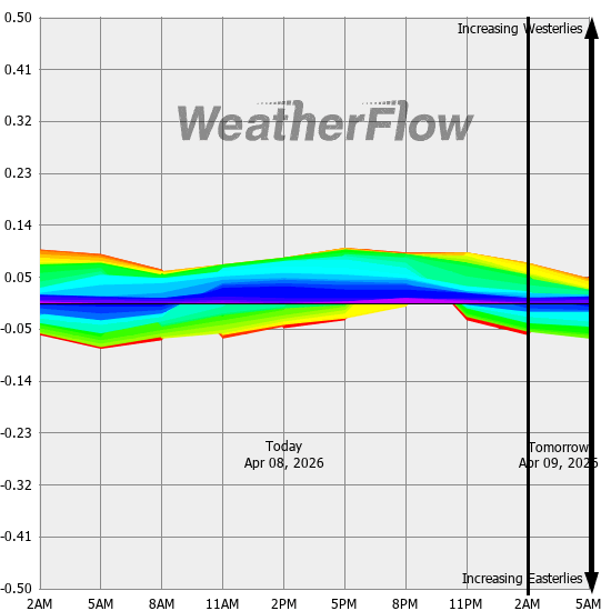 Computer forecast models generally can not resolve the topography of the Gorge and hence model predicted winds are often inaccurate. However, models can predict localized air pressure changes with a great deal of accuracy and it's these pressure differences (gradients) that drive the winds through the Gorge. The above "windbow" is a tool that our Meteorologists have developed to provide a powerful quick look of model predicted gradients.