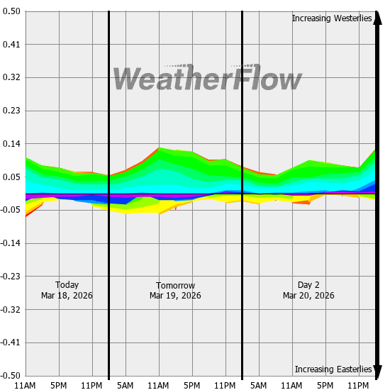 Computer forecast models generally can not resolve the topography of the Gorge and hence model predicted winds are often inaccurate. However, models can predict localized air pressure changes with a great deal of accuracy and it's these pressure differences (gradients) that drive the winds through the Gorge. The above "windbow" is a tool that our Meteorologists have developed to provide a powerful quick look of model predicted gradients.