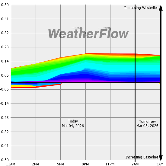 Computer forecast models generally can not resolve the topography of the Gorge and hence model predicted winds are often inaccurate. However, models can predict localized air pressure changes with a great deal of accuracy and it's these pressure differences (gradients) that drive the winds through the Gorge. The above "windbow" is a tool that our Meteorologists have developed to provide a powerful quick look of model predicted gradients.