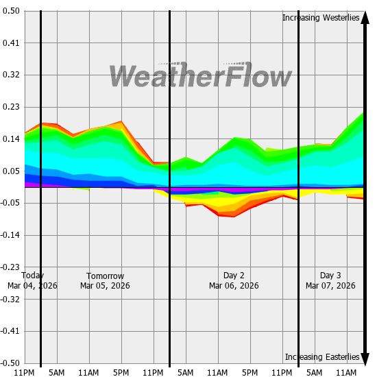 Computer forecast models generally can not resolve the topography of the Gorge and hence model predicted winds are often inaccurate. However, models can predict localized air pressure changes with a great deal of accuracy and it's these pressure differences (gradients) that drive the winds through the Gorge. The above "windbow" is a tool that our Meteorologists have developed to provide a powerful quick look of model predicted gradients.