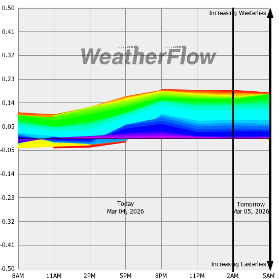 Computer forecast models generally can not resolve the topography of the Gorge and hence model predicted winds are often inaccurate. However, models can predict localized air pressure changes with a great deal of accuracy and it's these pressure differences (gradients) that drive the winds through the Gorge. The above "windbow" is a tool that our Meteorologists have developed to provide a powerful quick look of model predicted gradients.