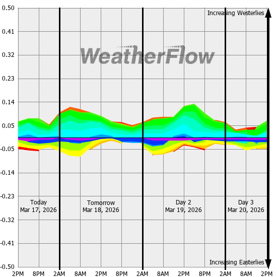 Computer forecast models generally can not resolve the topography of the Gorge and hence model predicted winds are often inaccurate. However, models can predict localized air pressure changes with a great deal of accuracy and it's these pressure differences (gradients) that drive the winds through the Gorge. The above "windbow" is a tool that our Meteorologists have developed to provide a powerful quick look of model predicted gradients.