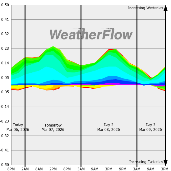 Computer forecast models generally can not resolve the topography of the Gorge and hence model predicted winds are often inaccurate. However, models can predict localized air pressure changes with a great deal of accuracy and it's these pressure differences (gradients) that drive the winds through the Gorge. The above "windbow" is a tool that our Meteorologists have developed to provide a powerful quick look of model predicted gradients.